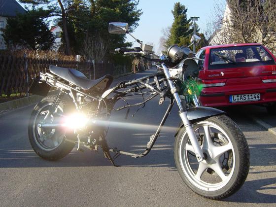 Baujahr 1990 | 84000 km | BT45,Wilbers,Koni hinten,Stahlflex vorn,Sintermetall, FE-hinten, Bugspoiler, Storm- Scheinwerfer, Streetbar, Lenkerendenblinker, kleine Spiegel, Alu-Streckgitter-Grill, hohes Kennzeichen, Doppelrücklicht 21/5W, schwarze Halogen-Miniblinker hinten, LED Tacho blau (Kolben, KW-Lager, Zahnräder, ölkette, Kupplungskorb, Auspuff)