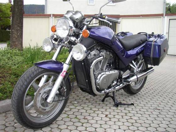 2 Zusatzscheinwerfer HELLA 2 Starktonhörner Gabelstabi INOX Eigenbau Kühlerverkleidung INOX- Eigenbau GIVI-rack für topcase 2 Seitenkoffer purple Stahlflex vorne+hinten Kleines Windschild